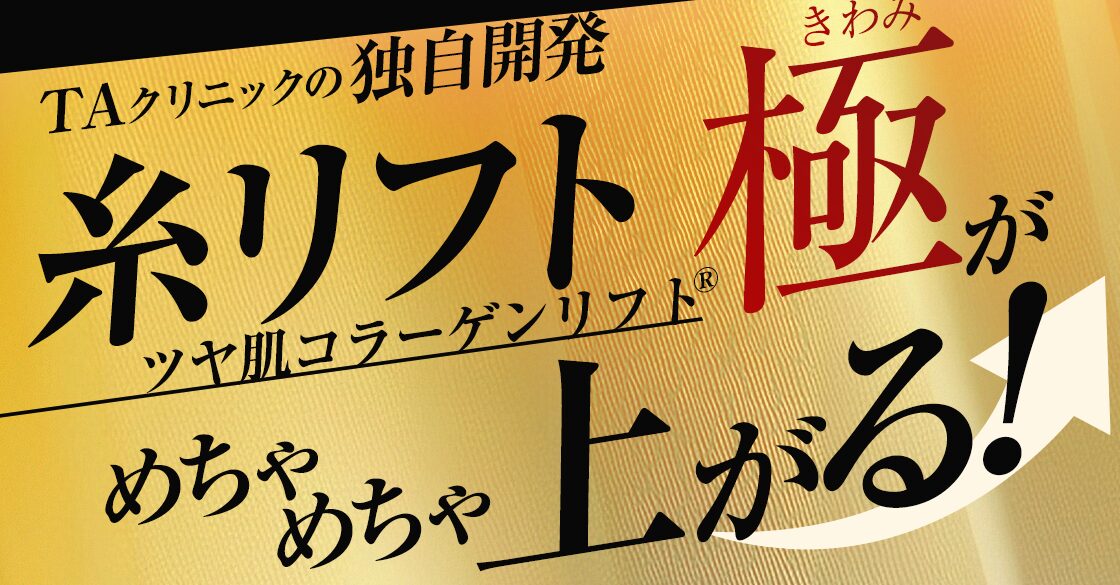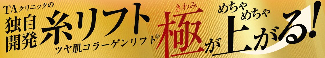 「TAC式ツヤ肌コラーゲンリフト®」は、TAクリニックが独自で開発した強力な極細糸を用いて行う“切らないリフトアップ術”です。 頬・額・首・チークラインなどの気になるフェイスラインのたるみを引き上げることが可能です。 |